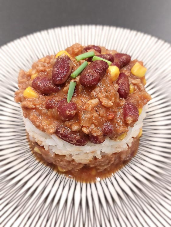 06 Rectifiez l'assaisonnement si besoin en fin de cuisson. Servez le chili con carne bien chaud dans des bols avec du riz.