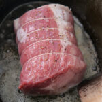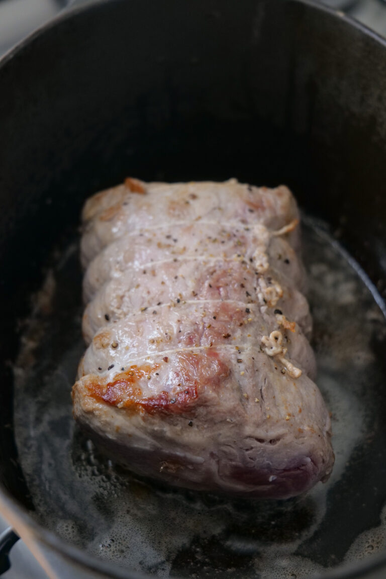 02 Une fois le rôti bien coloré, baissez le feu. Ajoutez les gousses d’ail écrasées, le thym, le laurier et la sauge. Salez et poivrez généreusement.