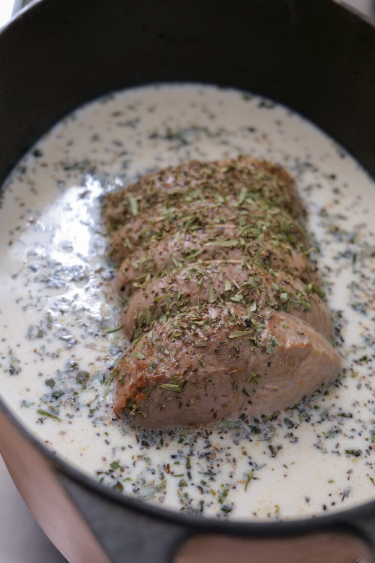 03 Une fois la cuisson terminée, retirez la viande et laissez-la reposer 10 minutes sous du papier aluminium. Pendant ce temps, faites réduire le jus de cuisson à feu vif si nécessaire. Le lait va former de petits "grumeaux" savoureux (la coagulation normale des protéines du lait) : c'est le signe d'une sauce réussie !